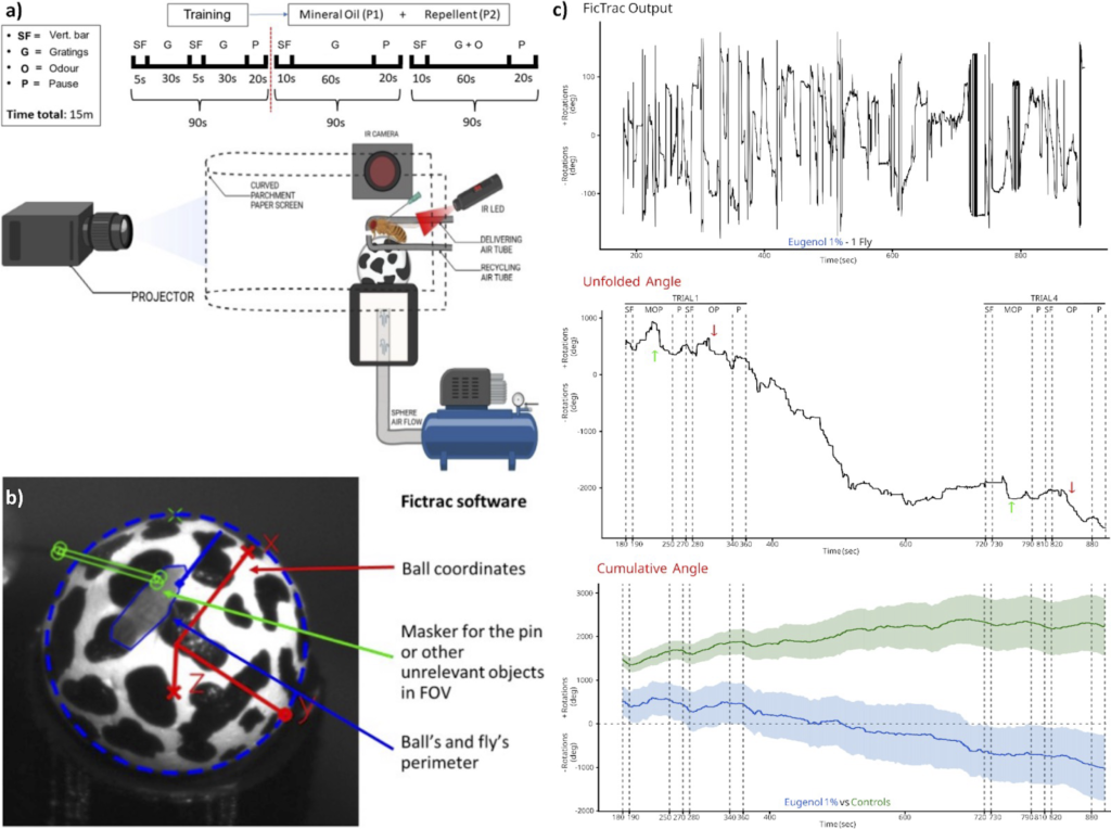 (c) In descending order: example of one FicTrac [40] raw output, deconvoluted data, and one sample of the cumulated tracks from Controls (green) and Eugenol 1% (blue) groups (mean ± s.d.). SF: stripe fixation. MOP: mineral oil phase (plain oil + gratings). OP: odorant phase (oil + odorant + gratings; Controls experienced 2 consecutive MOP instead). P: pause (darkness). Note that the training portion (the first part of the paradigm) was excluded from the analysis. Regarding the original versus transformed output from FicTrac [40] calculations: when the limit of ± 3 radians are reached, the coordinate system is flipped to the opposite sign. Inversion points were identified as those points where the first derivative exceeded 2 times the standard deviation.